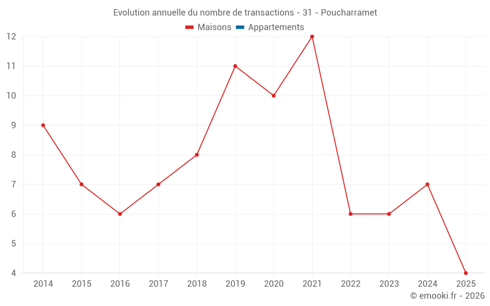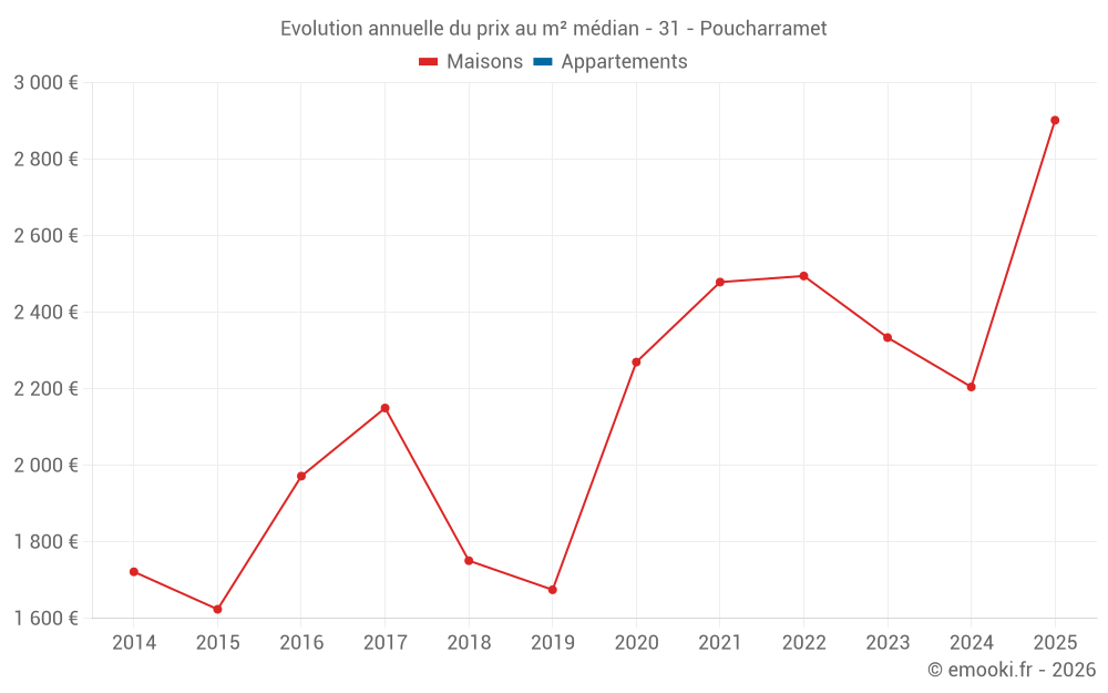 Le prix médian sur les 14 transactions de maisons des 24 derniers mois dans la commune de Poucharramet était de 2 202 € par mètre carré pour une valeur foncière médiane de 247 735 €. Sur cette période 60% des transactions se sont situées entre 1 823 et 3 292 € par mètre carré (du 2ème au 8ème déciles).
