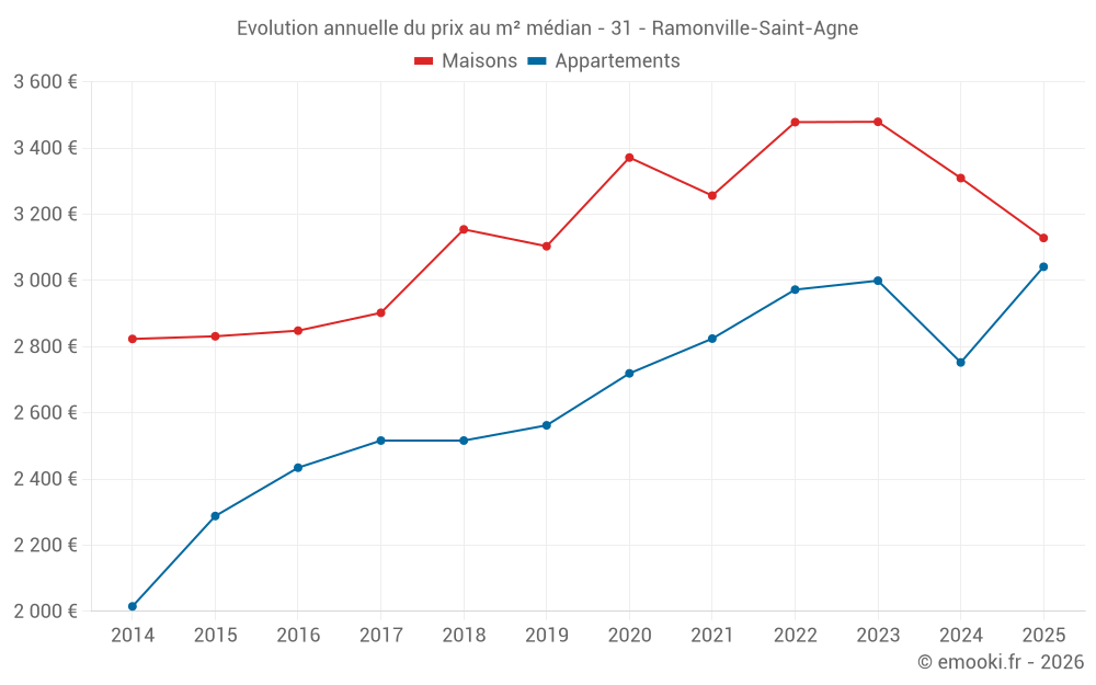 Le prix médian sur les 21 transactions de maisons des 6 derniers mois dans la commune de Ramonville-Saint-Agne était de 3 128 € par mètre carré pour une valeur foncière médiane de 375 000 €. Sur cette période 60% des transactions se sont situées entre 2 755 et 4 337 € par mètre carré (du 2ème au 8ème déciles).