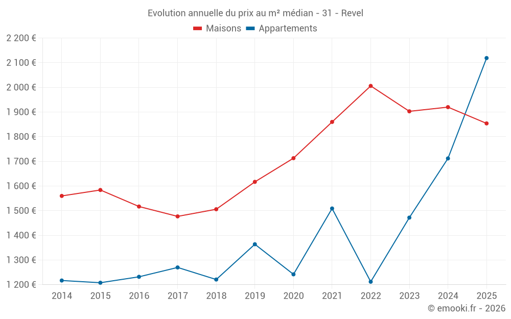 Le prix médian sur les 29 transactions d'appartements des 24 derniers mois dans la commune de Revel était de 1 667 € par mètre carré pour une valeur foncière médiane de 98 000 €. Sur cette période 60% des transactions se sont situées entre 1 196 et 2 117 € par mètre carré (du 2ème au 8ème déciles).
