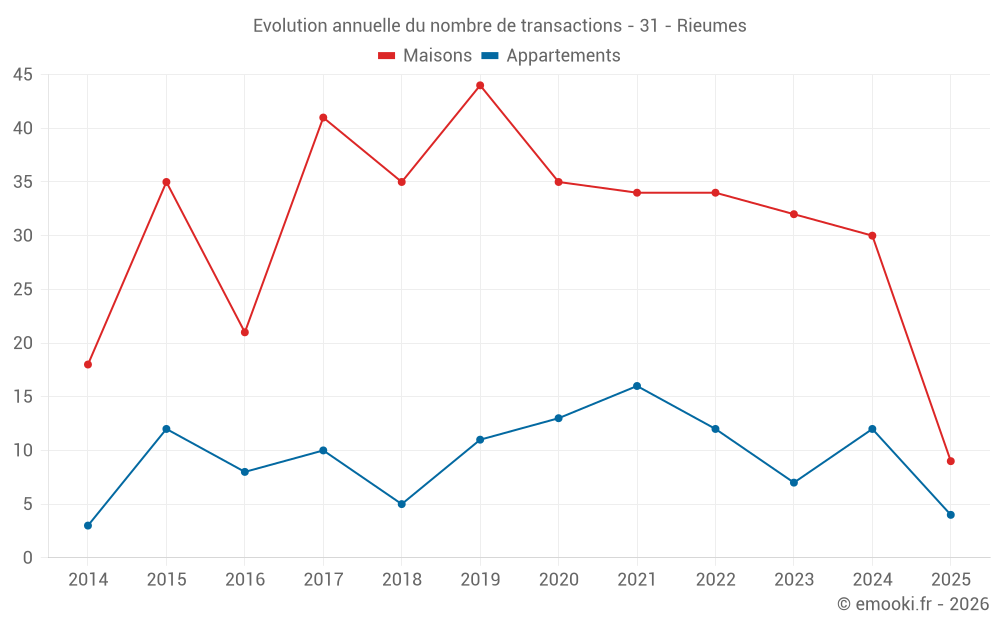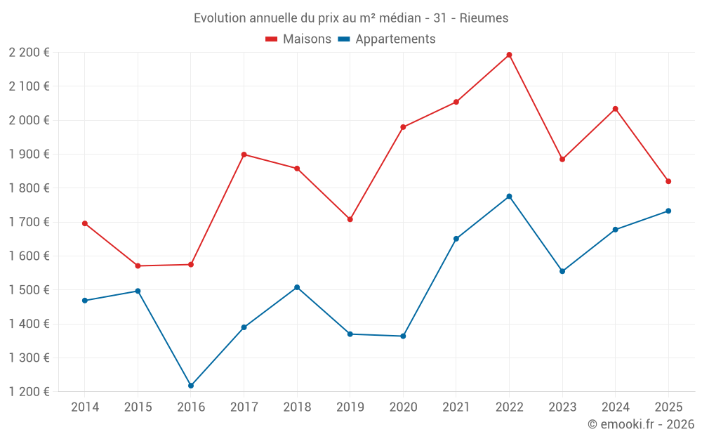 Le prix médian sur les 22 transactions de maisons des 12 derniers mois dans la commune de Rieumes était de 1 986 € par mètre carré pour une valeur foncière médiane de 194 317 €. Sur cette période 60% des transactions se sont situées entre 1 423 et 2 451 € par mètre carré (du 2ème au 8ème déciles).