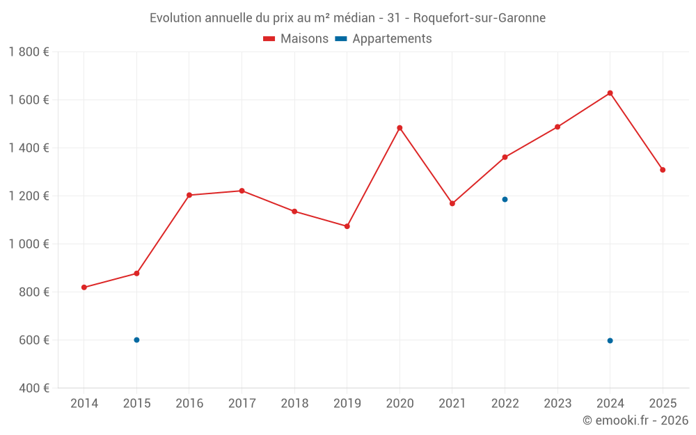 Le prix médian sur les 20 transactions de maisons des 24 derniers mois dans la commune de Roquefort-sur-Garonne était de 1 309 € par mètre carré pour une valeur foncière médiane de 138 638 €. Sur cette période 60% des transactions se sont situées entre 778 et 2 123 € par mètre carré (du 2ème au 8ème déciles).