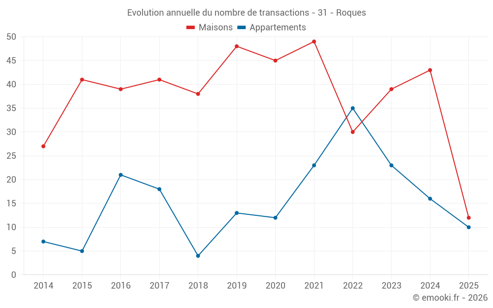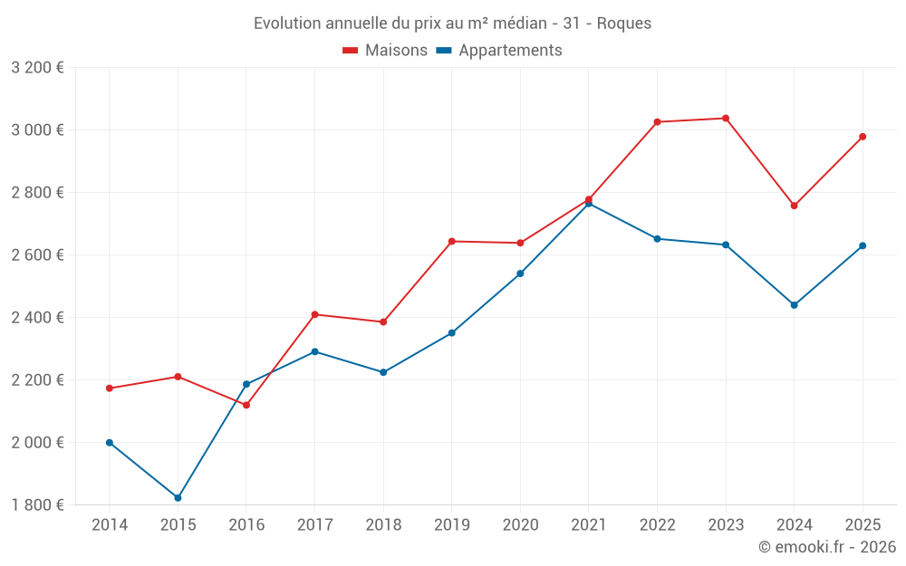 Le prix médian sur les 41 transactions de maisons des 12 derniers mois dans la commune de Roques était de 2 857 € par mètre carré pour une valeur foncière médiane de 242 180 €. Sur cette période 60% des transactions se sont situées entre 2 450 et 3 228 € par mètre carré (du 2ème au 8ème déciles).