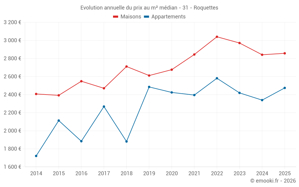 Le prix médian sur les 26 transactions d'appartements des 24 derniers mois dans la commune de Roquettes était de 2 350 € par mètre carré pour une valeur foncière médiane de 119 300 €. Sur cette période 60% des transactions se sont situées entre 1 980 et 2 628 € par mètre carré (du 2ème au 8ème déciles).