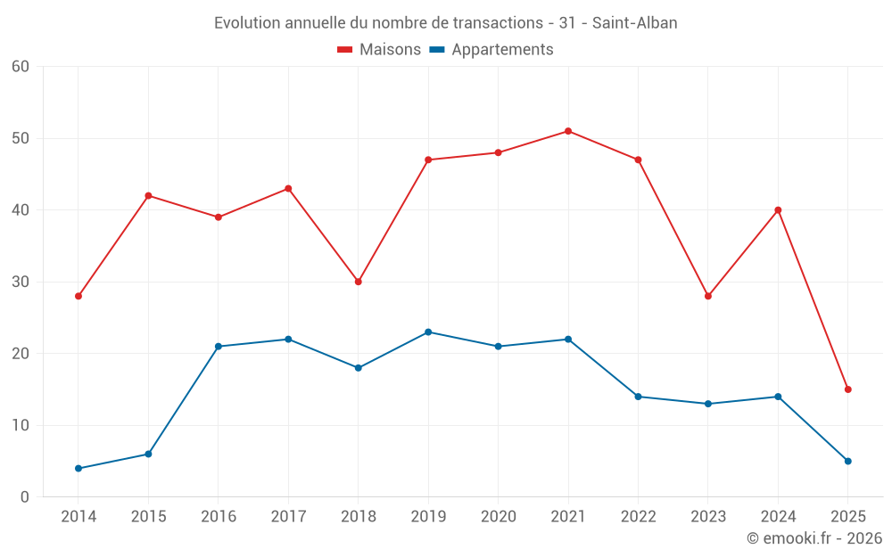 Le prix médian sur les 35 transactions de maisons des 12 derniers mois dans la commune de Saint-Alban était de 2 761 € par mètre carré pour une valeur foncière médiane de 268 100 €. Sur cette période 60% des transactions se sont situées entre 2 356 et 3 305 € par mètre carré (du 2ème au 8ème déciles).