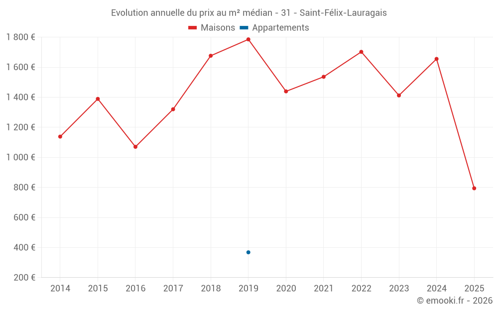 Le prix médian sur les 20 transactions de maisons des 24 derniers mois dans la commune de Saint-Félix-Lauragais était de 1 504 € par mètre carré pour une valeur foncière médiane de 152 450 €. Sur cette période 60% des transactions se sont situées entre 979 et 1 842 € par mètre carré (du 2ème au 8ème déciles).