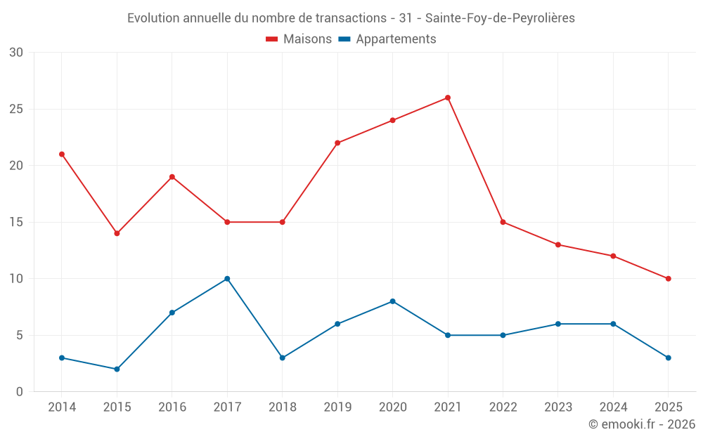Le prix médian sur les 19 transactions de maisons des 12 derniers mois dans la commune de Sainte-Foy-de-Peyrolières était de 2 326 € par mètre carré pour une valeur foncière médiane de 288 450 €. Sur cette période 60% des transactions se sont situées entre 1 703 et 2 801 € par mètre carré (du 2ème au 8ème déciles).