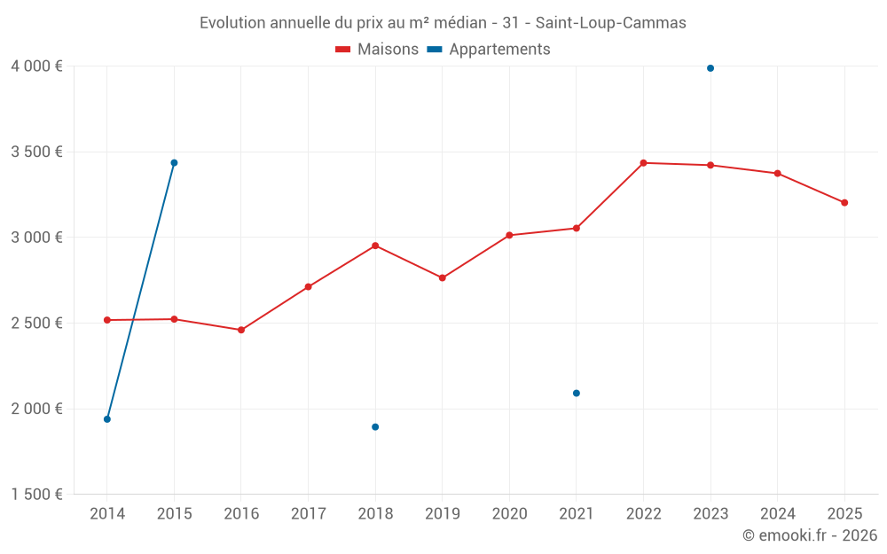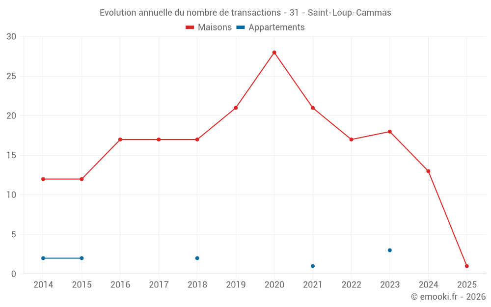 Le prix médian sur les 22 transactions de maisons des 24 derniers mois dans la commune de Saint-Loup-Cammas était de 3 352 € par mètre carré pour une valeur foncière médiane de 362 340 €. Sur cette période 60% des transactions se sont situées entre 2 952 et 3 512 € par mètre carré (du 2ème au 8ème déciles).