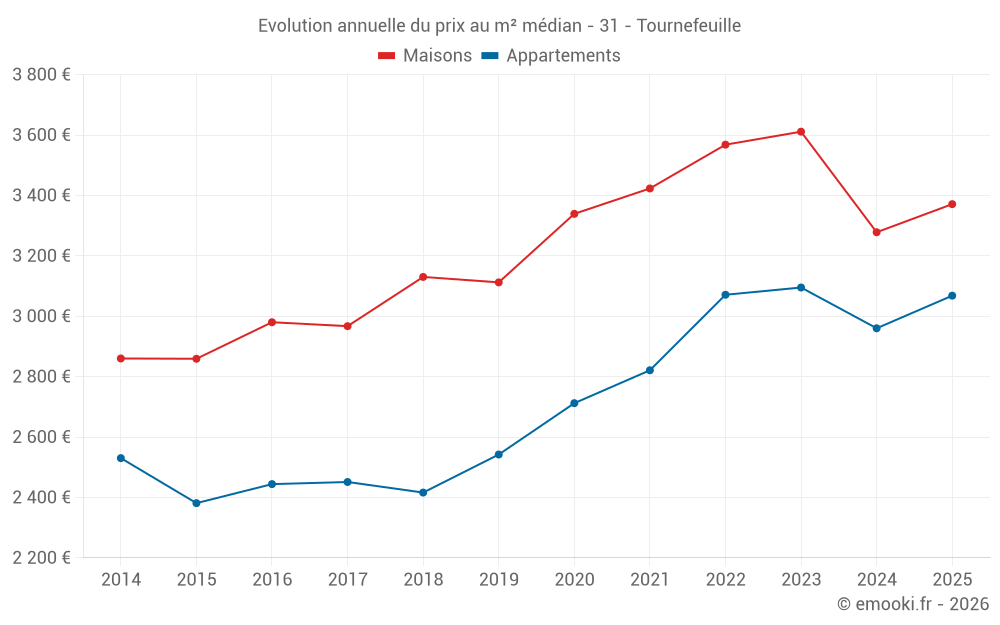 Le prix médian sur les 26 transactions de maisons des 3 derniers mois dans la commune de Tournefeuille était de 3 263 € par mètre carré pour une valeur foncière médiane de 356 940 €. Sur cette période 60% des transactions se sont situées entre 2 143 et 3 779 € par mètre carré (du 2ème au 8ème déciles).