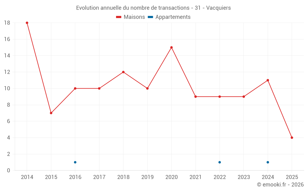 Le prix médian sur les 22 transactions de maisons des 24 derniers mois dans la commune de Vacquiers était de 2 554 € par mètre carré pour une valeur foncière médiane de 248 000 €. Sur cette période 60% des transactions se sont situées entre 2 214 et 3 245 € par mètre carré (du 2ème au 8ème déciles).