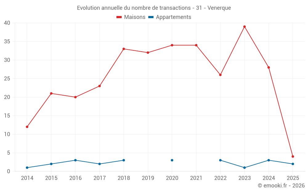 Le prix médian sur les 16 transactions de maisons des 12 derniers mois dans la commune de Venerque était de 2 914 € par mètre carré pour une valeur foncière médiane de 301 482 €. Sur cette période 60% des transactions se sont situées entre 2 537 et 3 548 € par mètre carré (du 2ème au 8ème déciles).