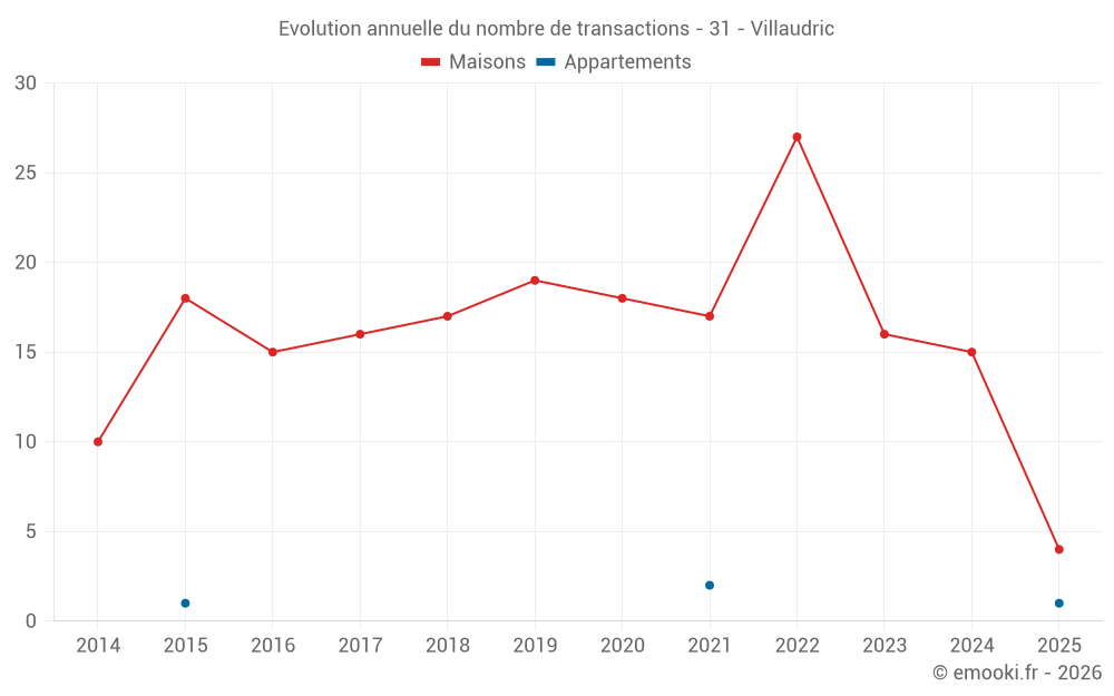 Le prix médian sur les 27 transactions de maisons des 24 derniers mois dans la commune de Villaudric était de 2 315 € par mètre carré pour une valeur foncière médiane de 270 000 €. Sur cette période 60% des transactions se sont situées entre 1 723 et 2 938 € par mètre carré (du 2ème au 8ème déciles).