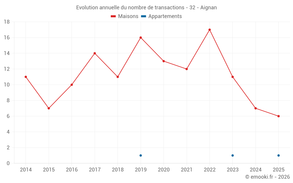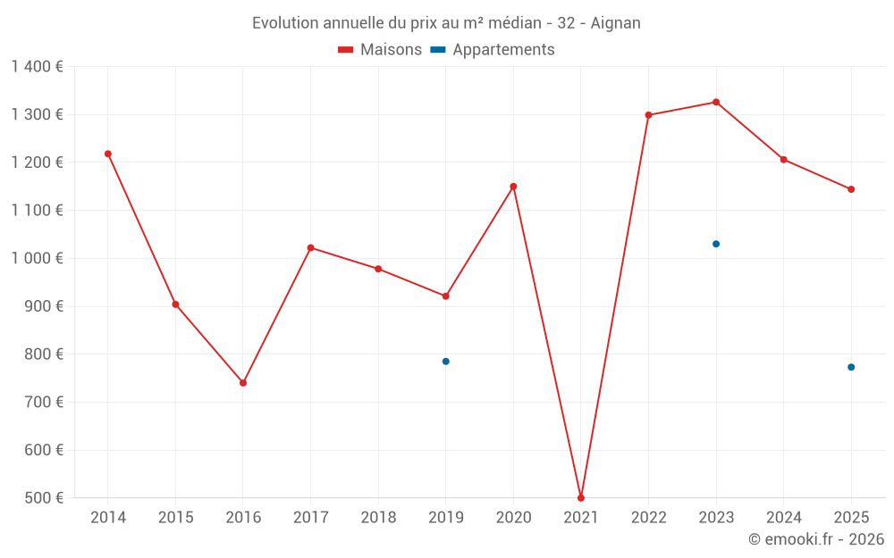 Le prix médian sur les 20 transactions de maisons des 24 derniers mois dans la commune d'Aignan était de 1 198 € par mètre carré pour une valeur foncière médiane de 120 895 €. Sur cette période 60% des transactions se sont situées entre 737 et 1 668 € par mètre carré (du 2ème au 8ème déciles).