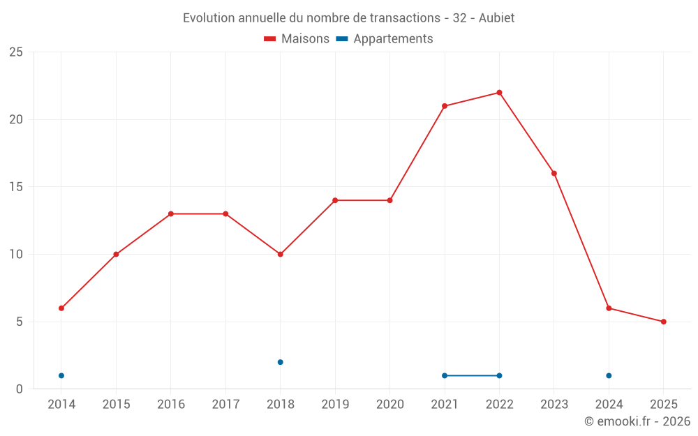 Le prix médian sur les 18 transactions de maisons des 24 derniers mois dans la commune d'Aubiet était de 1 761 € par mètre carré pour une valeur foncière médiane de 163 885 €. Sur cette période 60% des transactions se sont situées entre 1 016 et 2 473 € par mètre carré (du 2ème au 8ème déciles).