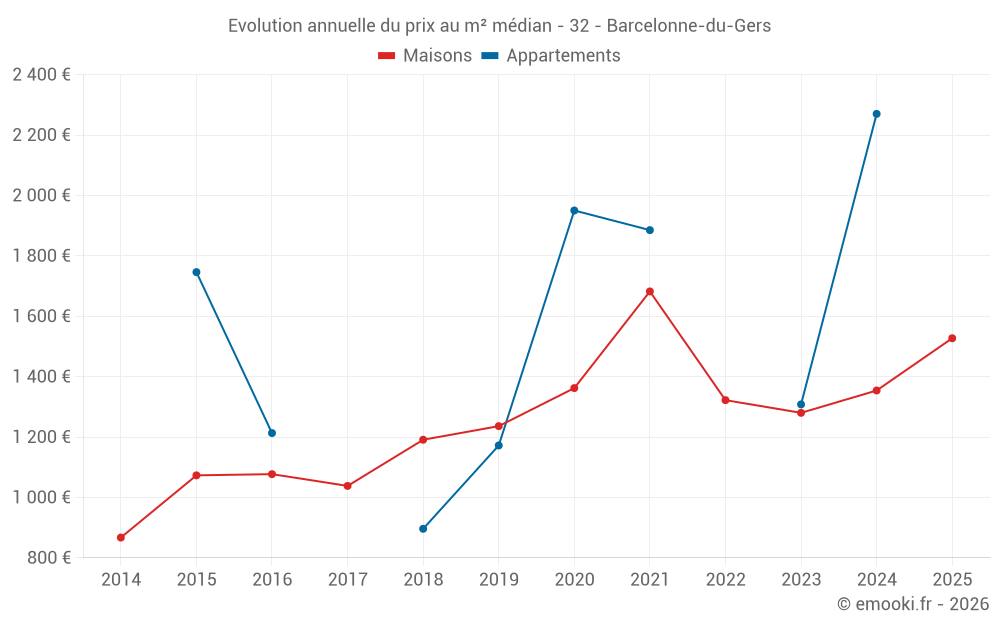Le prix médian sur les 17 transactions de maisons des 12 derniers mois dans la commune de Barcelonne-du-Gers était de 1 296 € par mètre carré pour une valeur foncière médiane de 153 000 €. Sur cette période 60% des transactions se sont situées entre 998 et 1 831 € par mètre carré (du 2ème au 8ème déciles).