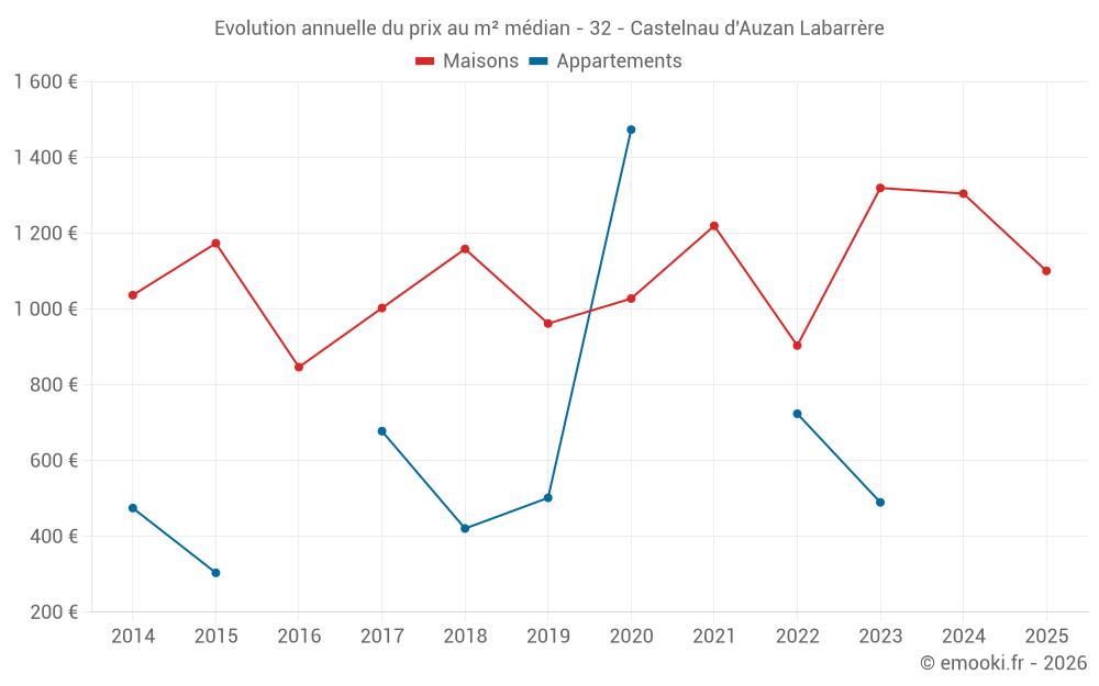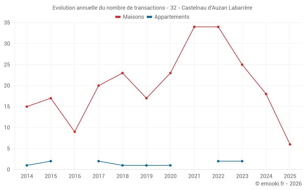 Le prix médian sur les 18 transactions de maisons des 12 derniers mois dans la commune de Castelnau d'Auzan Labarrère était de 1 305 € par mètre carré pour une valeur foncière médiane de 137 500 €. Sur cette période 60% des transactions se sont situées entre 776 et 2 001 € par mètre carré (du 2ème au 8ème déciles).