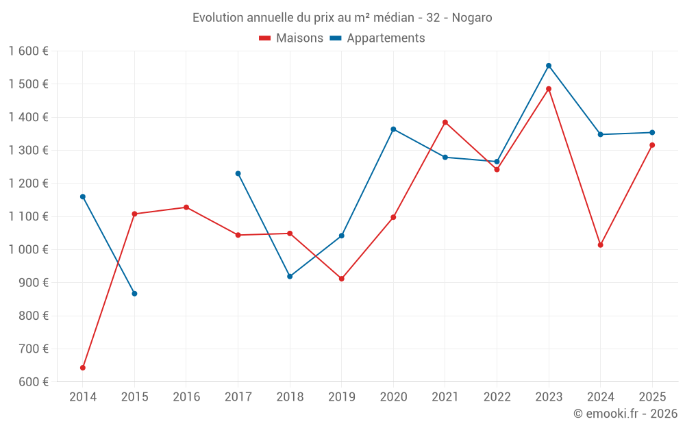 Le prix médian sur les 20 transactions d'appartements des 24 derniers mois dans la commune de Nogaro était de 1 372 € par mètre carré pour une valeur foncière médiane de 81 000 €. Sur cette période 60% des transactions se sont situées entre 1 100 et 1 643 € par mètre carré (du 2ème au 8ème déciles).