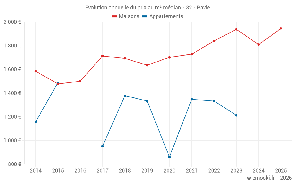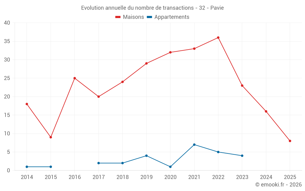 Le prix médian sur les 36 transactions de maisons des 24 derniers mois dans la commune de Pavie était de 1 859 € par mètre carré pour une valeur foncière médiane de 172 725 €. Sur cette période 60% des transactions se sont situées entre 1 618 et 2 185 € par mètre carré (du 2ème au 8ème déciles).