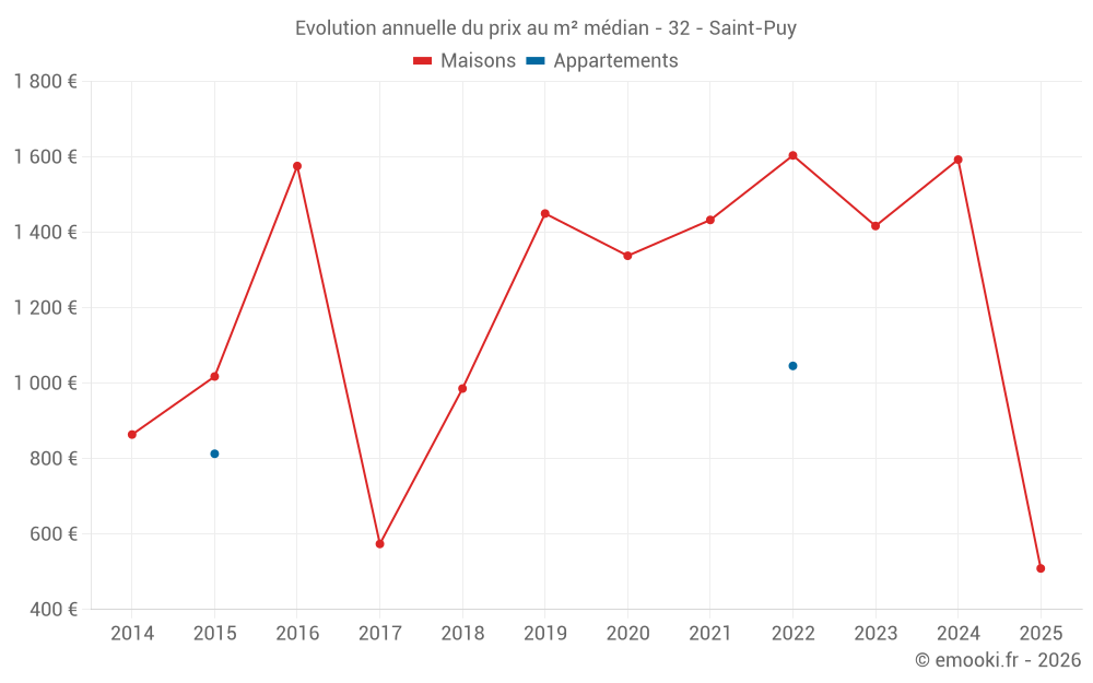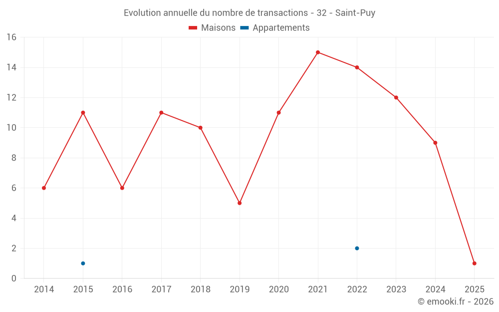 Le prix médian sur les 16 transactions de maisons des 24 derniers mois dans la commune de Saint-Puy était de 1 288 € par mètre carré pour une valeur foncière médiane de 144 000 €. Sur cette période 60% des transactions se sont situées entre 667 et 1 762 € par mètre carré (du 2ème au 8ème déciles).