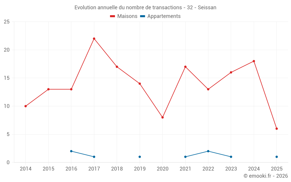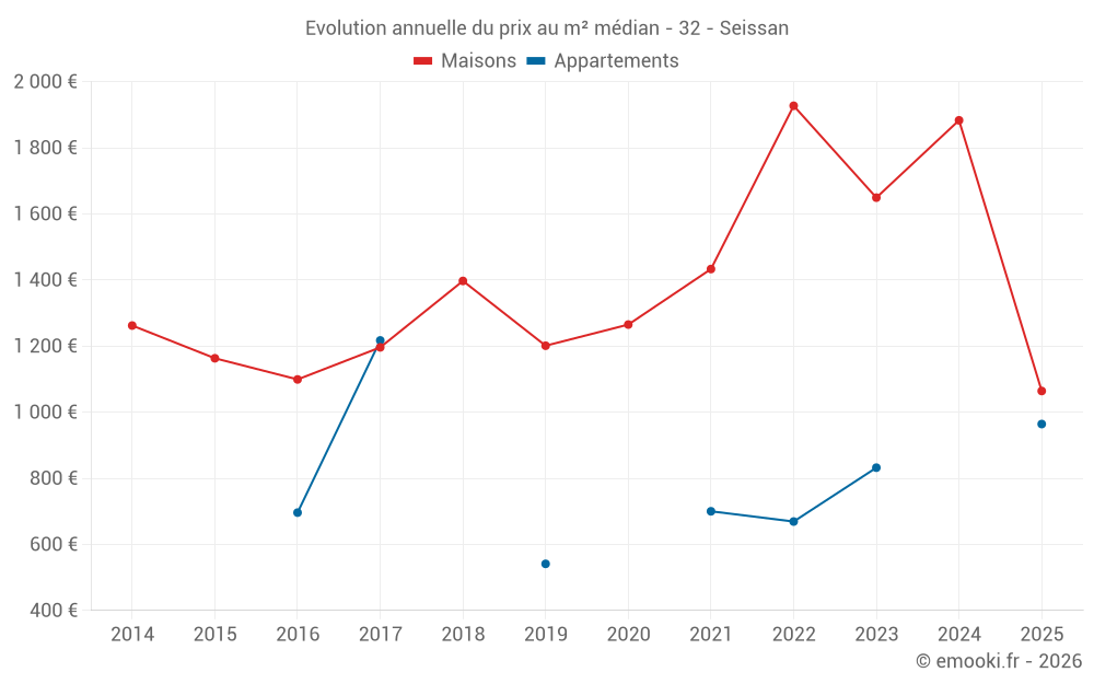 Le prix médian sur les 18 transactions de maisons des 12 derniers mois dans la commune de Seissan était de 1 601 € par mètre carré pour une valeur foncière médiane de 157 500 €. Sur cette période 60% des transactions se sont situées entre 1 061 et 2 225 € par mètre carré (du 2ème au 8ème déciles).
