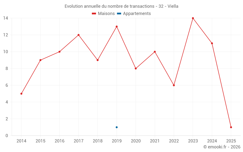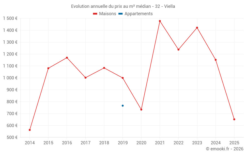 Le prix médian sur les 16 transactions de maisons des 24 derniers mois dans la commune de Viella était de 1 338 € par mètre carré pour une valeur foncière médiane de 189 427 €. Sur cette période 60% des transactions se sont situées entre 652 et 1 719 € par mètre carré (du 2ème au 8ème déciles).