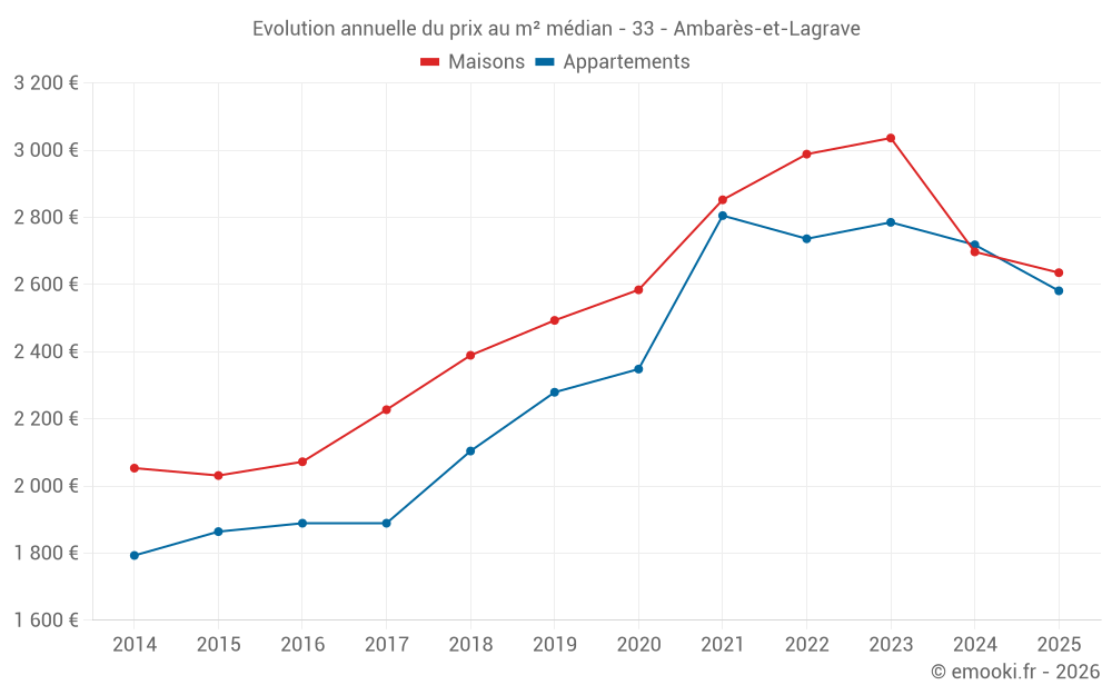 Le prix médian sur les 45 transactions de maisons des 6 derniers mois dans la commune d'Ambarès-et-Lagrave était de 2 635 € par mètre carré pour une valeur foncière médiane de 215 000 €. Sur cette période 60% des transactions se sont situées entre 1 957 et 3 243 € par mètre carré (du 2ème au 8ème déciles).