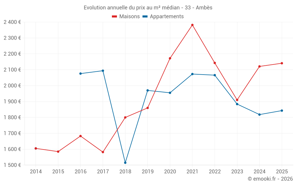 Le prix médian sur les 22 transactions de maisons des 12 derniers mois dans la commune d'Ambès était de 2 142 € par mètre carré pour une valeur foncière médiane de 197 750 €. Sur cette période 60% des transactions se sont situées entre 1 787 et 2 639 € par mètre carré (du 2ème au 8ème déciles).