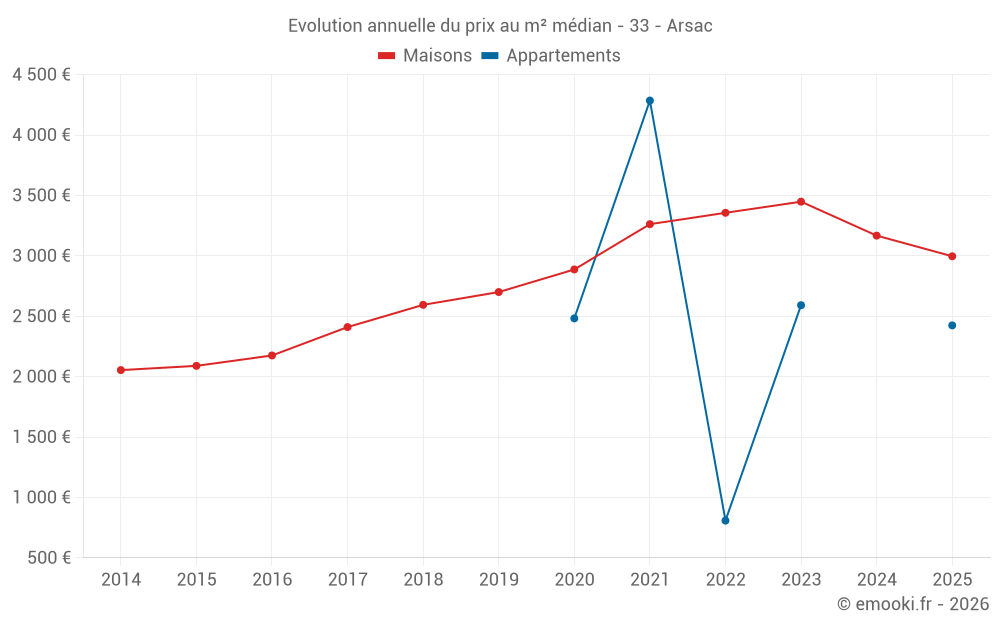Le prix médian sur les 41 transactions de maisons des 12 derniers mois dans la commune d'Arsac était de 3 125 € par mètre carré pour une valeur foncière médiane de 330 000 €. Sur cette période 60% des transactions se sont situées entre 2 620 et 3 681 € par mètre carré (du 2ème au 8ème déciles).