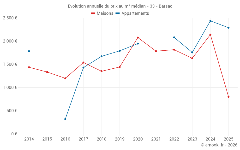 Le prix médian sur les 21 transactions de maisons des 12 derniers mois dans la commune de Barsac était de 1 813 € par mètre carré pour une valeur foncière médiane de 167 000 €. Sur cette période 60% des transactions se sont situées entre 1 070 et 2 667 € par mètre carré (du 2ème au 8ème déciles).