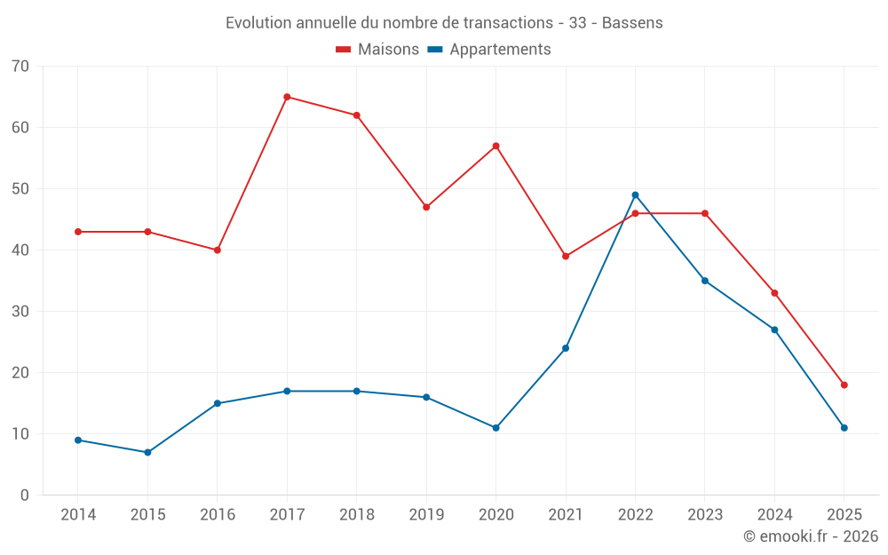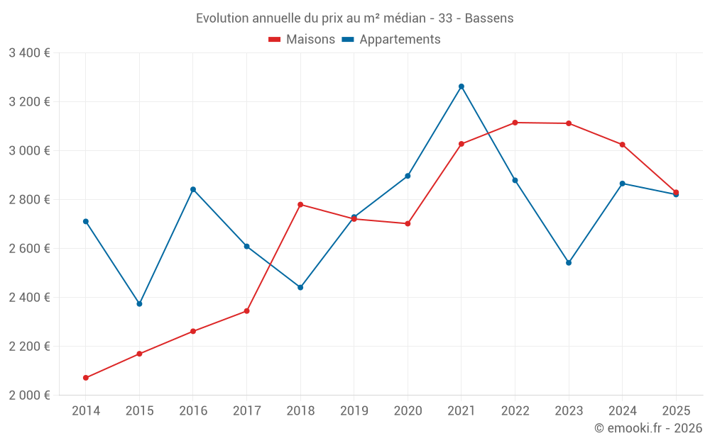 Le prix médian sur les 18 transactions de maisons des 6 derniers mois dans la commune de Bassens était de 2 830 € par mètre carré pour une valeur foncière médiane de 228 208 €. Sur cette période 60% des transactions se sont situées entre 2 453 et 3 377 € par mètre carré (du 2ème au 8ème déciles).