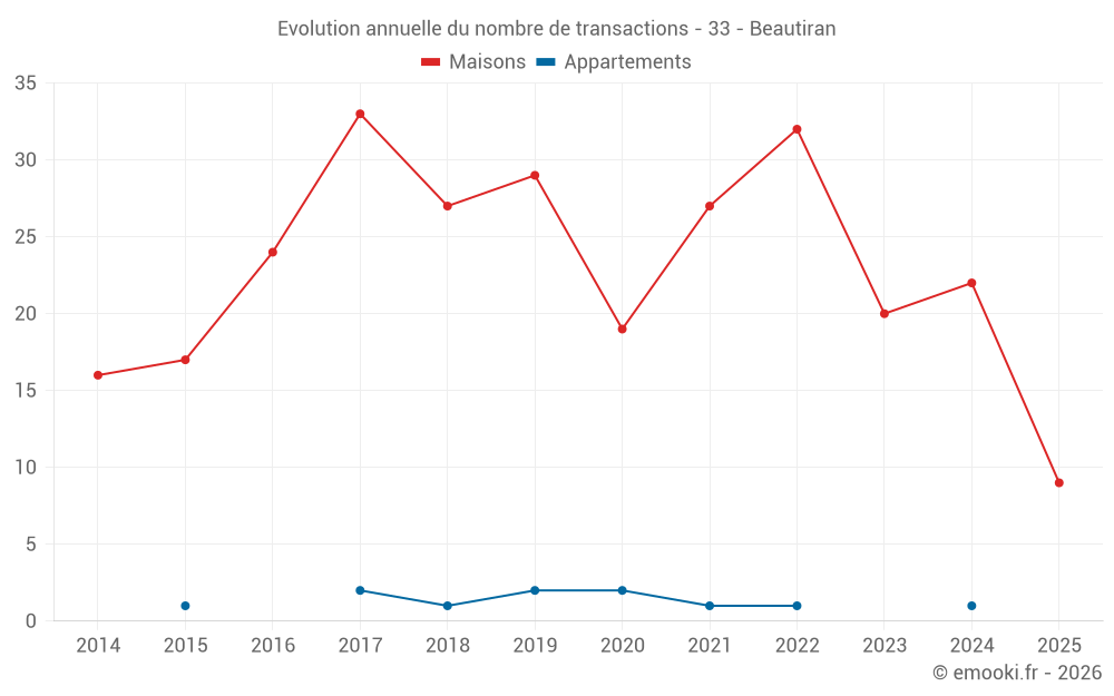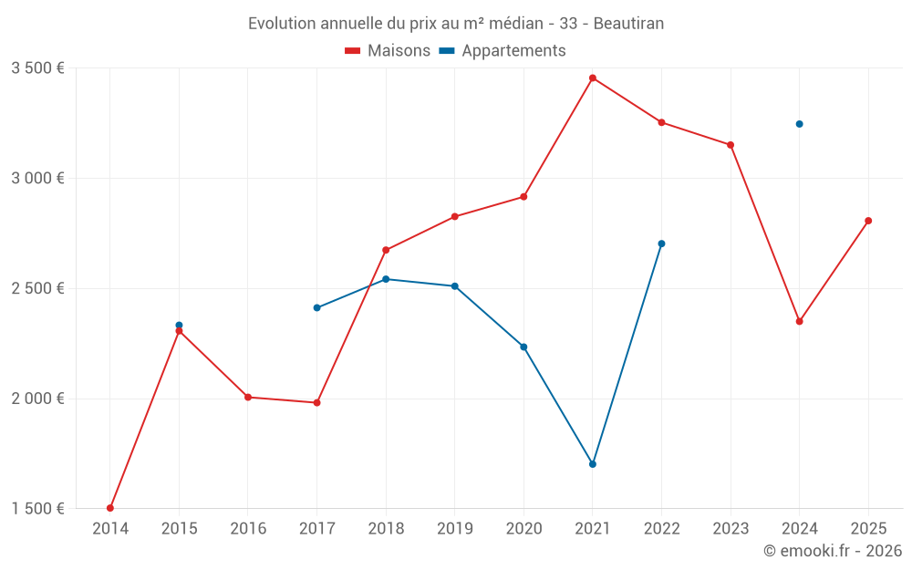 Le prix médian sur les 21 transactions de maisons des 12 derniers mois dans la commune de Beautiran était de 2 390 € par mètre carré pour une valeur foncière médiane de 282 000 €. Sur cette période 60% des transactions se sont situées entre 1 550 et 3 291 € par mètre carré (du 2ème au 8ème déciles).