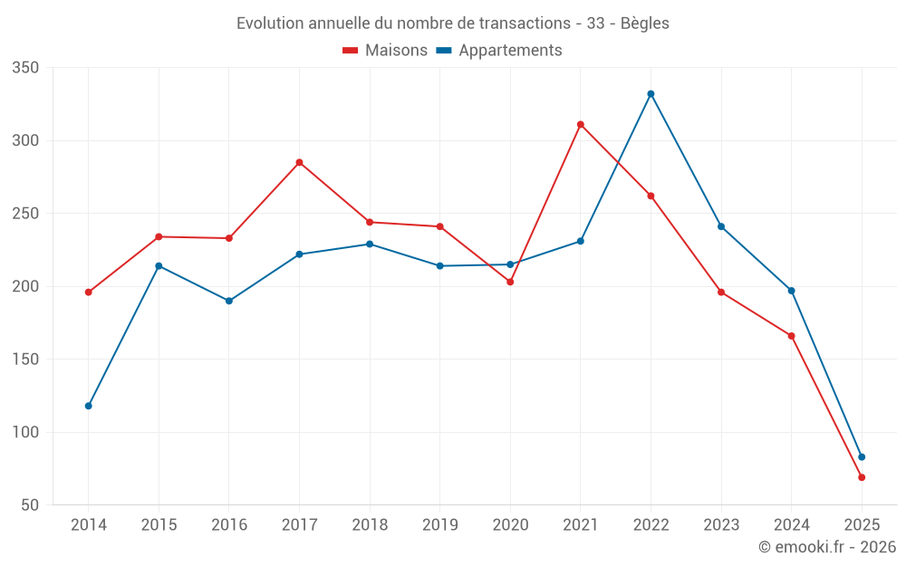 Le prix médian sur les 27 transactions de maisons des 3 derniers mois dans la commune de Bègles était de 4 067 € par mètre carré pour une valeur foncière médiane de 322 000 €. Sur cette période 60% des transactions se sont situées entre 2 577 et 5 060 € par mètre carré (du 2ème au 8ème déciles).