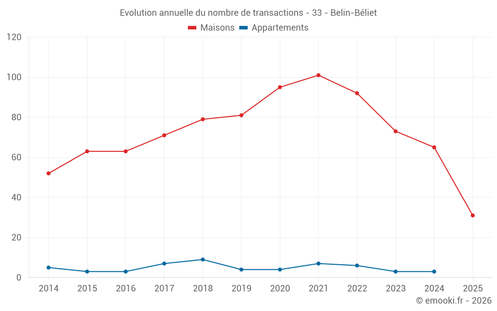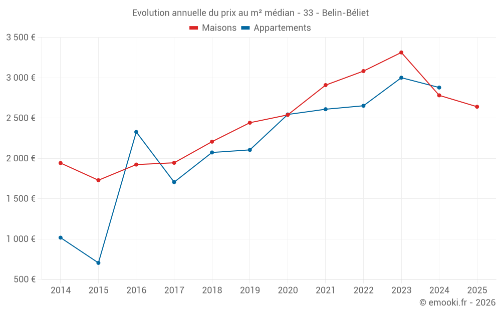 Le prix médian sur les 31 transactions de maisons des 6 derniers mois dans la commune de Belin-Béliet était de 2 640 € par mètre carré pour une valeur foncière médiane de 254 000 €. Sur cette période 60% des transactions se sont situées entre 2 232 et 3 119 € par mètre carré (du 2ème au 8ème déciles).