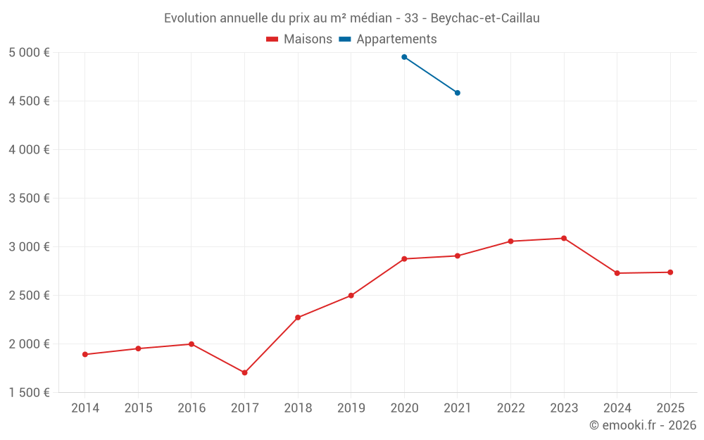 Le prix médian sur les 18 transactions de maisons des 12 derniers mois dans la commune de Beychac-et-Caillau était de 2 733 € par mètre carré pour une valeur foncière médiane de 316 525 €. Sur cette période 60% des transactions se sont situées entre 2 233 et 3 223 € par mètre carré (du 2ème au 8ème déciles).