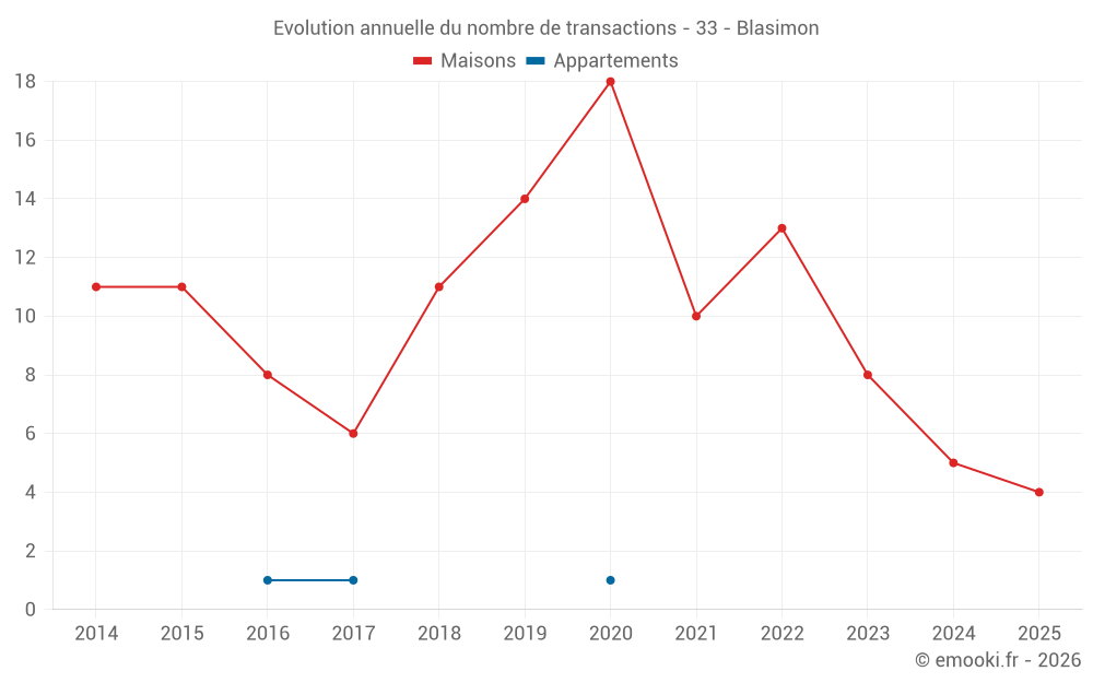 Le prix médian sur les 14 transactions de maisons des 24 derniers mois dans la commune de Blasimon était de 1 658 € par mètre carré pour une valeur foncière médiane de 216 000 €. Sur cette période 60% des transactions se sont situées entre 1 041 et 1 952 € par mètre carré (du 2ème au 8ème déciles).