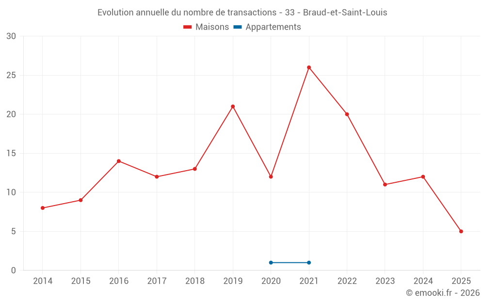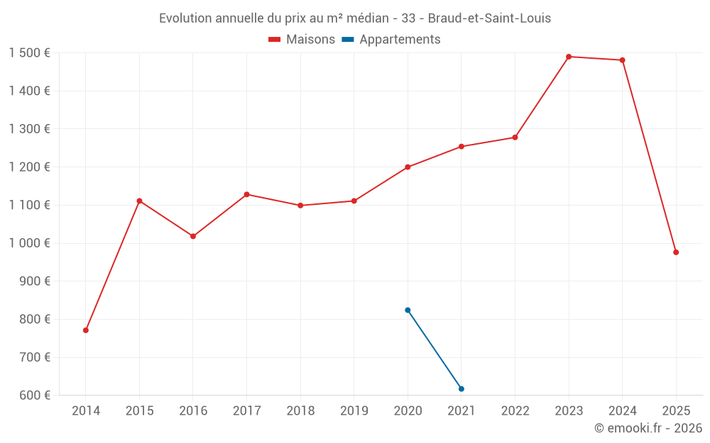 Le prix médian sur les 21 transactions de maisons des 24 derniers mois dans la commune de Braud-et-Saint-Louis était de 1 323 € par mètre carré pour une valeur foncière médiane de 120 000 €. Sur cette période 60% des transactions se sont situées entre 971 et 2 107 € par mètre carré (du 2ème au 8ème déciles).