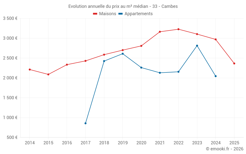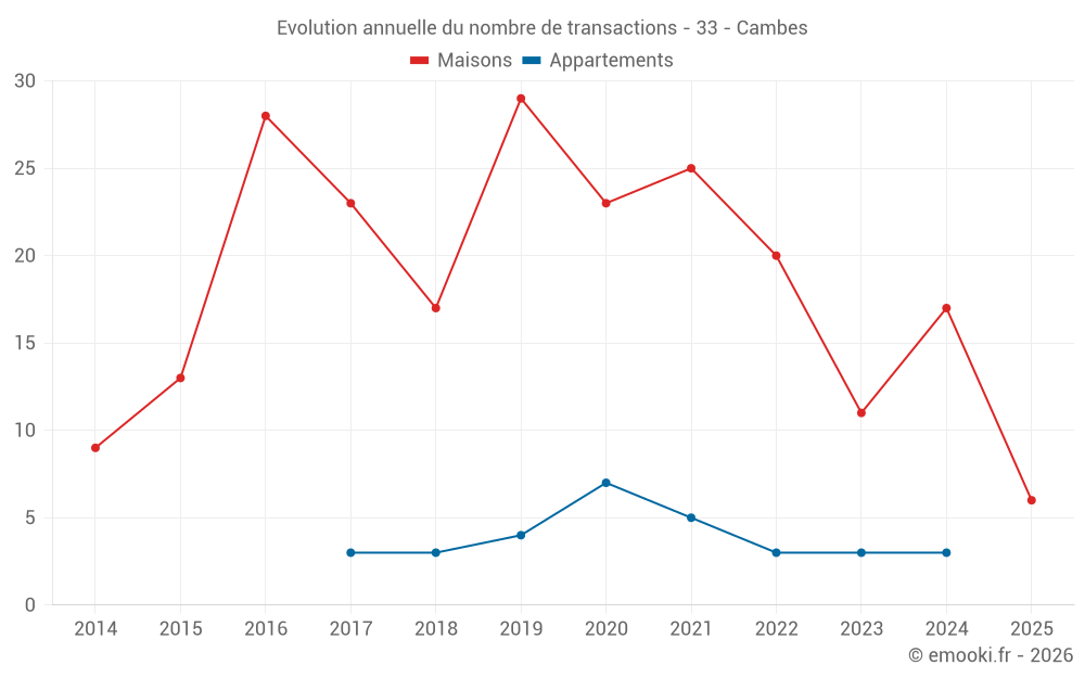 Le prix médian sur les 19 transactions de maisons des 12 derniers mois dans la commune de Cambes était de 2 857 € par mètre carré pour une valeur foncière médiane de 240 000 €. Sur cette période 60% des transactions se sont situées entre 2 242 et 3 682 € par mètre carré (du 2ème au 8ème déciles).