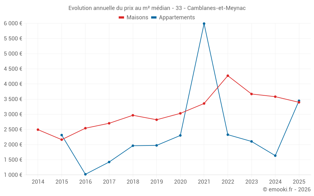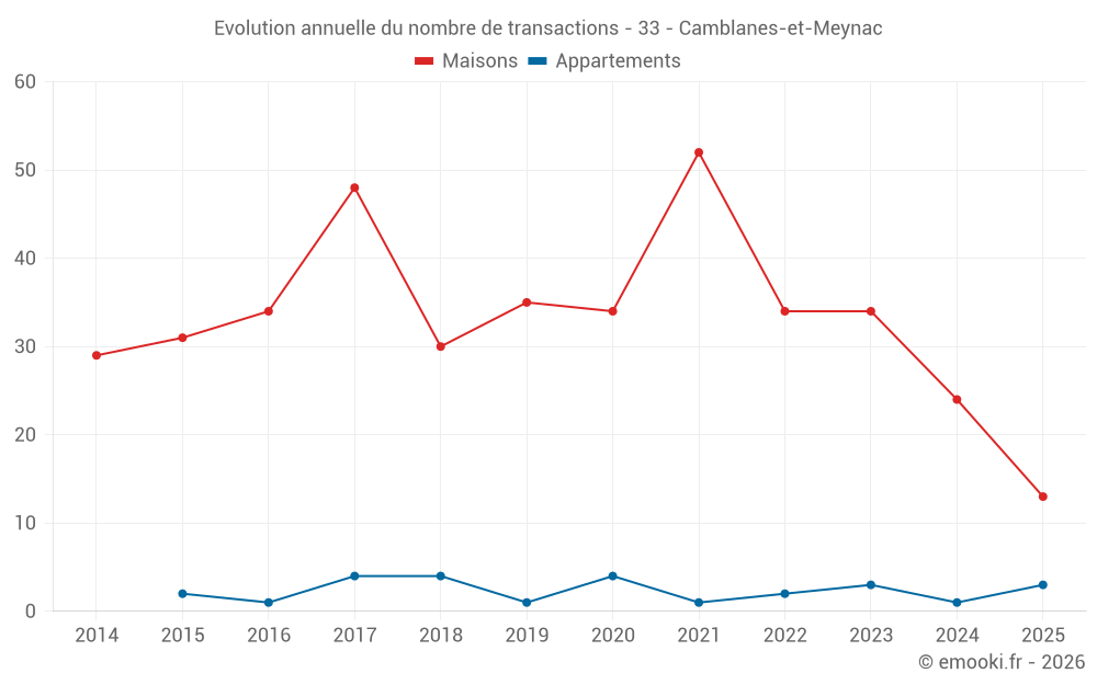 Le prix médian sur les 24 transactions de maisons des 12 derniers mois dans la commune de Camblanes-et-Meynac était de 3 565 € par mètre carré pour une valeur foncière médiane de 299 200 €. Sur cette période 60% des transactions se sont situées entre 2 417 et 4 070 € par mètre carré (du 2ème au 8ème déciles).