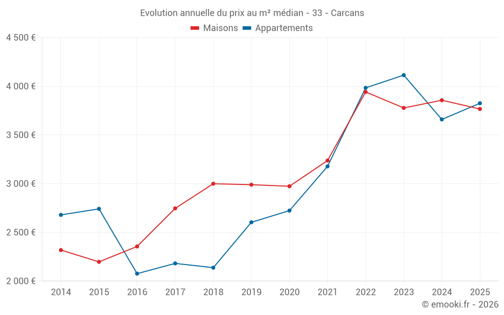 Le prix médian sur les 22 transactions d'appartements des 12 derniers mois dans la commune de Carcans était de 3 826 € par mètre carré pour une valeur foncière médiane de 148 765 €. Sur cette période 60% des transactions se sont situées entre 3 535 et 5 104 € par mètre carré (du 2ème au 8ème déciles).