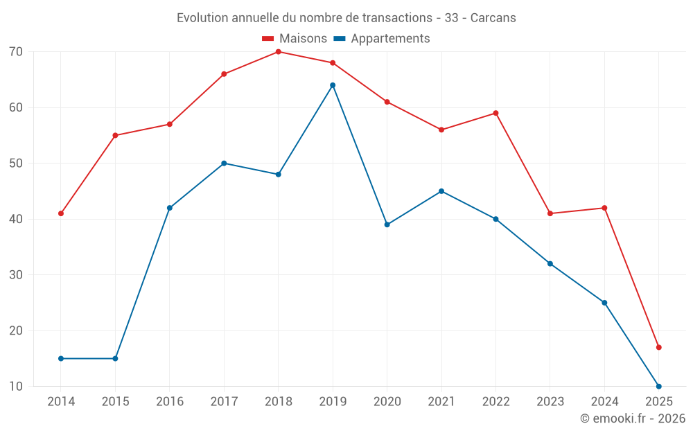 Le prix médian sur les 44 transactions de maisons des 12 derniers mois dans la commune de Carcans était de 3 794 € par mètre carré pour une valeur foncière médiane de 335 835 €. Sur cette période 60% des transactions se sont situées entre 2 536 et 4 839 € par mètre carré (du 2ème au 8ème déciles).