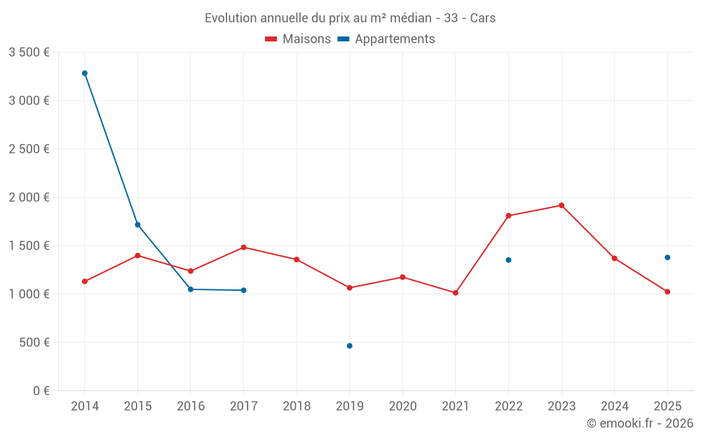Le prix médian sur les 25 transactions de maisons des 24 derniers mois dans la commune de Cars était de 1 563 € par mètre carré pour une valeur foncière médiane de 166 000 €. Sur cette période 60% des transactions se sont situées entre 1 239 et 2 204 € par mètre carré (du 2ème au 8ème déciles).