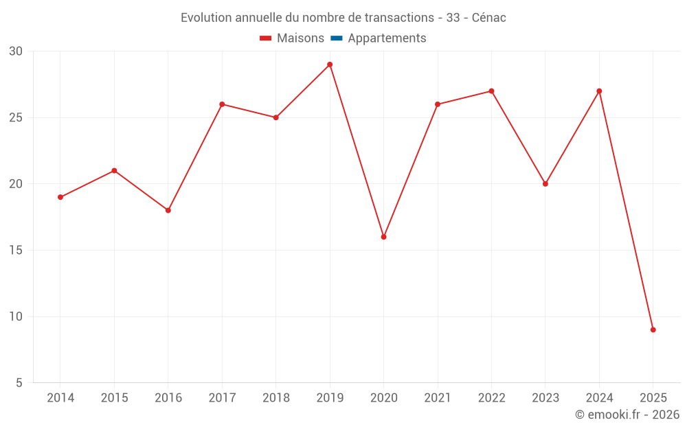 Le prix médian sur les 24 transactions de maisons des 12 derniers mois dans la commune de Cénac était de 2 842 € par mètre carré pour une valeur foncière médiane de 250 000 €. Sur cette période 60% des transactions se sont situées entre 2 359 et 3 413 € par mètre carré (du 2ème au 8ème déciles).
