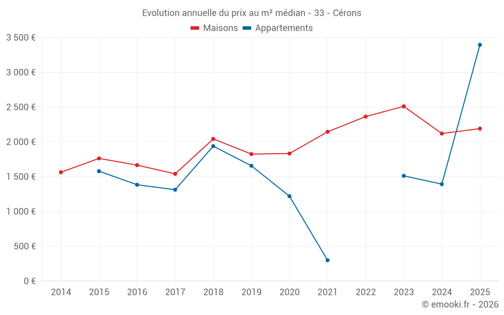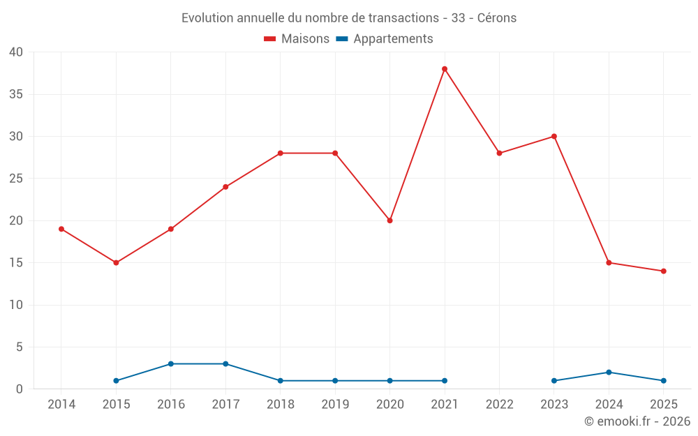 Le prix médian sur les 26 transactions de maisons des 12 derniers mois dans la commune de Cérons était de 2 034 € par mètre carré pour une valeur foncière médiane de 242 500 €. Sur cette période 60% des transactions se sont situées entre 1 653 et 2 706 € par mètre carré (du 2ème au 8ème déciles).