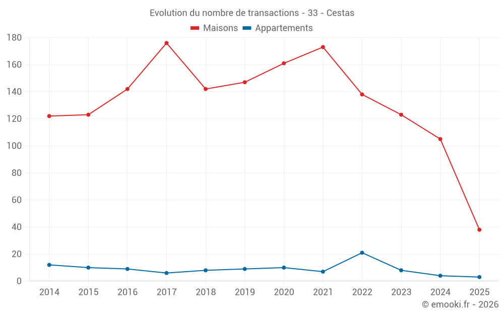 Le prix médian sur les 38 transactions de maisons des 6 derniers mois dans la commune de Cestas était de 3 604 € par mètre carré pour une valeur foncière médiane de 344 590 €. Sur cette période 60% des transactions se sont situées entre 2 679 et 4 136 € par mètre carré (du 2ème au 8ème déciles).