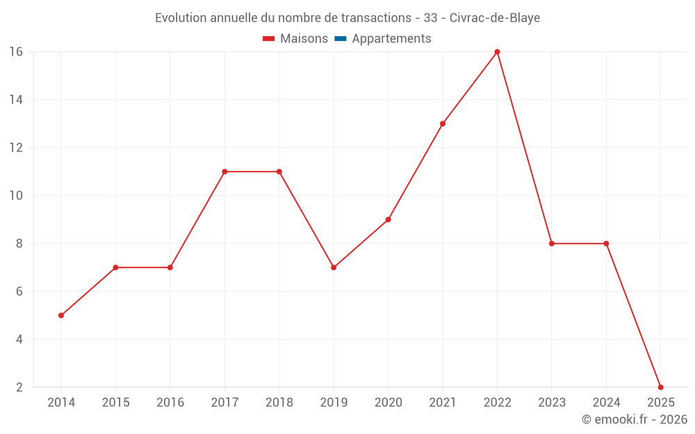 Le prix médian sur les 14 transactions de maisons des 24 derniers mois dans la commune de Civrac-de-Blaye était de 2 000 € par mètre carré pour une valeur foncière médiane de 204 926 €. Sur cette période 60% des transactions se sont situées entre 1 257 et 2 959 € par mètre carré (du 2ème au 8ème déciles).
