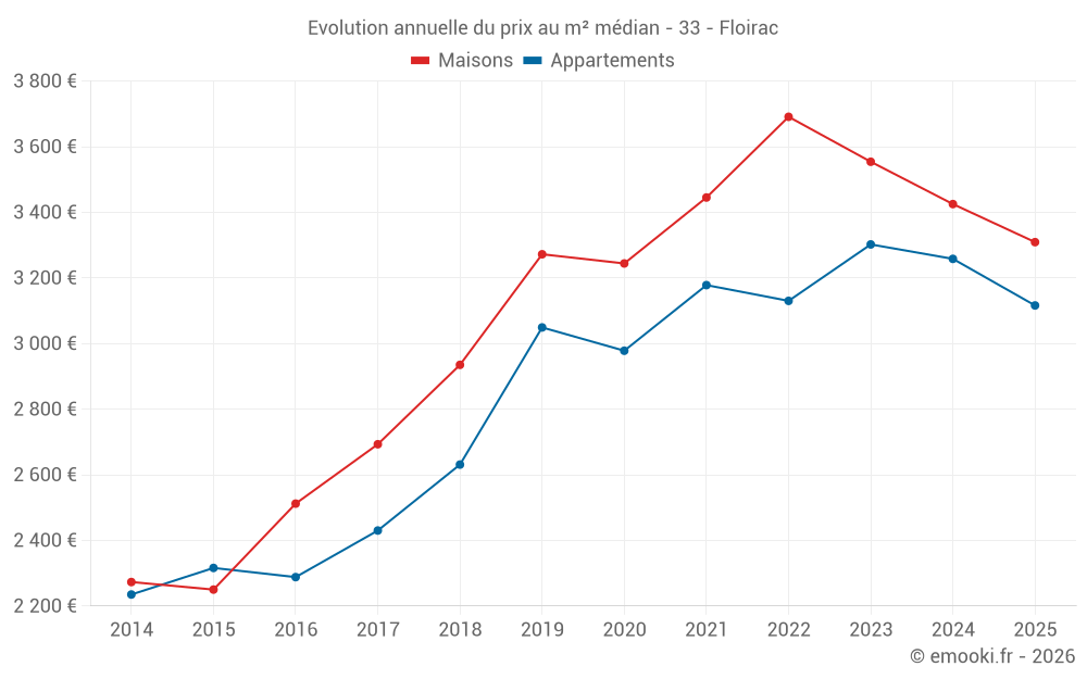 Le prix médian sur les 32 transactions de maisons des 6 derniers mois dans la commune de Floirac était de 3 309 € par mètre carré pour une valeur foncière médiane de 274 850 €. Sur cette période 60% des transactions se sont situées entre 2 929 et 3 739 € par mètre carré (du 2ème au 8ème déciles).