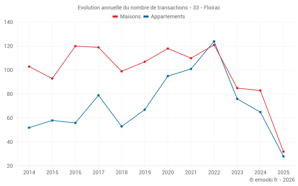 Le prix médian sur les 28 transactions d'appartements des 6 derniers mois dans la commune de Floirac était de 3 116 € par mètre carré pour une valeur foncière médiane de 181 786 €. Sur cette période 60% des transactions se sont situées entre 2 620 et 3 384 € par mètre carré (du 2ème au 8ème déciles).