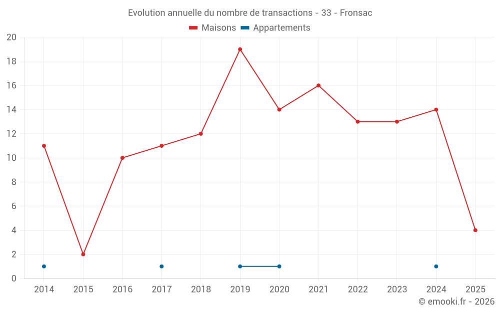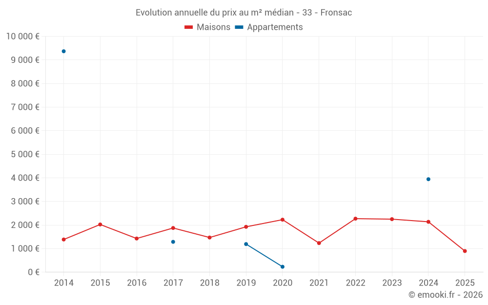 Le prix médian sur les 25 transactions de maisons des 24 derniers mois dans la commune de Fronsac était de 1 723 € par mètre carré pour une valeur foncière médiane de 252 500 €. Sur cette période 60% des transactions se sont situées entre 941 et 2 365 € par mètre carré (du 2ème au 8ème déciles).