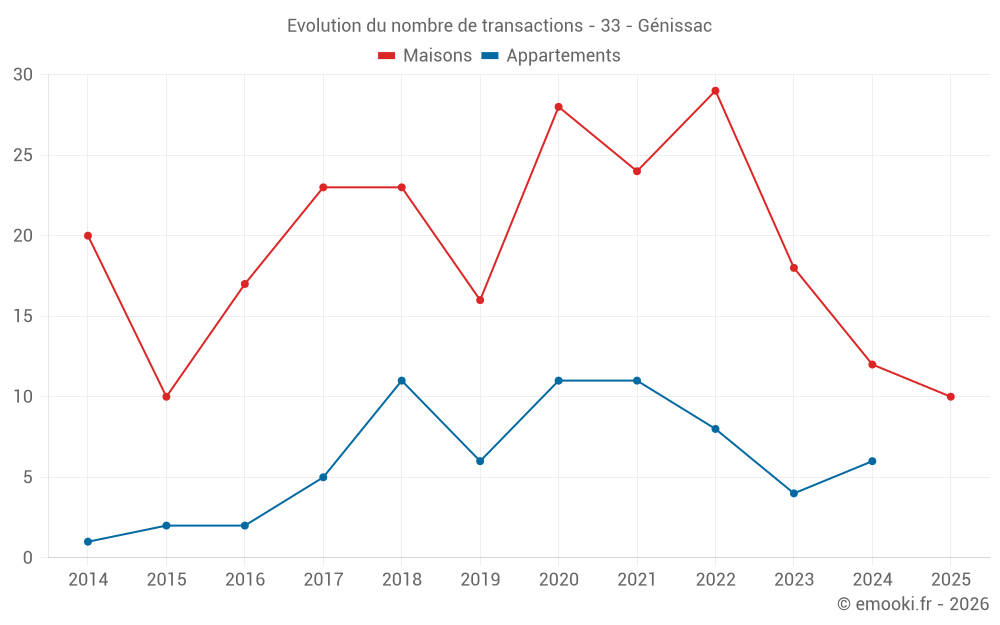 Le prix médian sur les 19 transactions de maisons des 12 derniers mois dans la commune de Génissac était de 2 395 € par mètre carré pour une valeur foncière médiane de 233 000 €. Sur cette période 60% des transactions se sont situées entre 1 760 et 2 662 € par mètre carré (du 2ème au 8ème déciles).