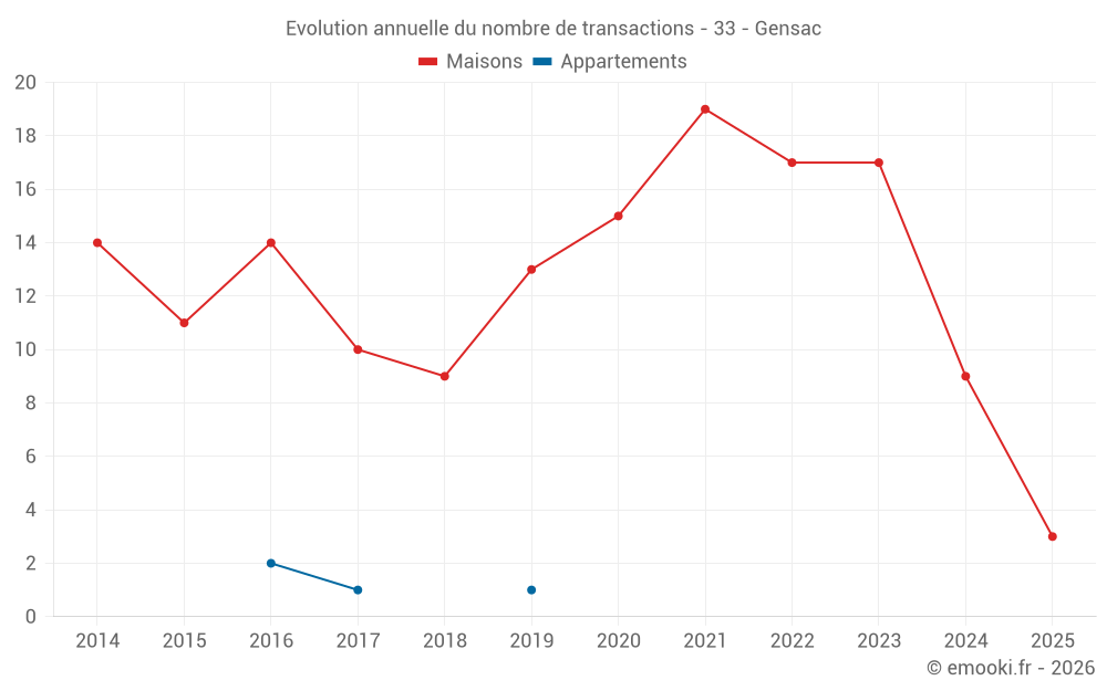 Le prix médian sur les 21 transactions de maisons des 24 derniers mois dans la commune de Gensac était de 1 290 € par mètre carré pour une valeur foncière médiane de 139 000 €. Sur cette période 60% des transactions se sont situées entre 1 143 et 1 933 € par mètre carré (du 2ème au 8ème déciles).