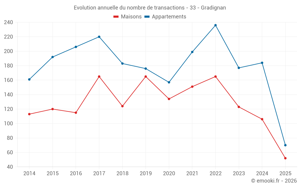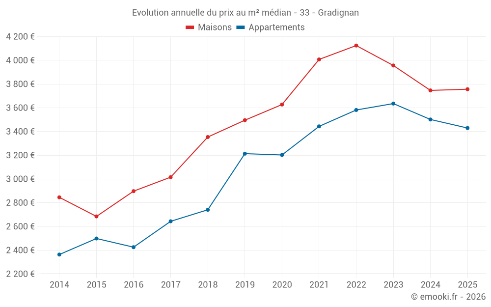 Le prix médian sur les 27 transactions de maisons des 3 derniers mois dans la commune de Gradignan était de 3 814 € par mètre carré pour une valeur foncière médiane de 376 250 €. Sur cette période 60% des transactions se sont situées entre 3 186 et 4 697 € par mètre carré (du 2ème au 8ème déciles).